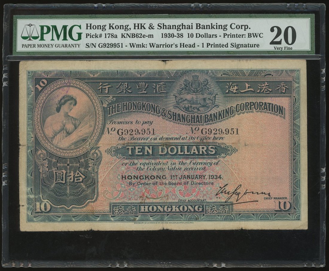 The Hongkong and Shanghai Banking Corporation, $10, 1.1.1934, serial number G929951, handsigned at lower left,