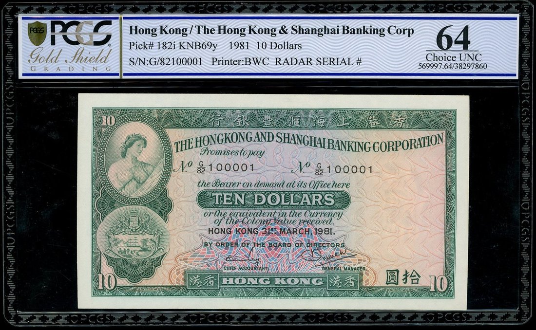 The Hongkong and Shanghai Banking Corporation, $10, 31.3.1981, radar serial number G/82 100001, (Pick 182i), PCGS Gold Shield 64 Choice Uncirculated