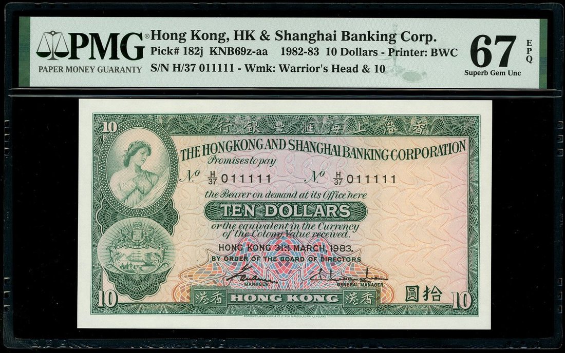 The Hongkong and Shanghai Banking Corporation, $10, 31.3.1983, fancy serial number H/37 011111, (Pick 182j), PMG 67EPQ Superb Gem Uncirculated