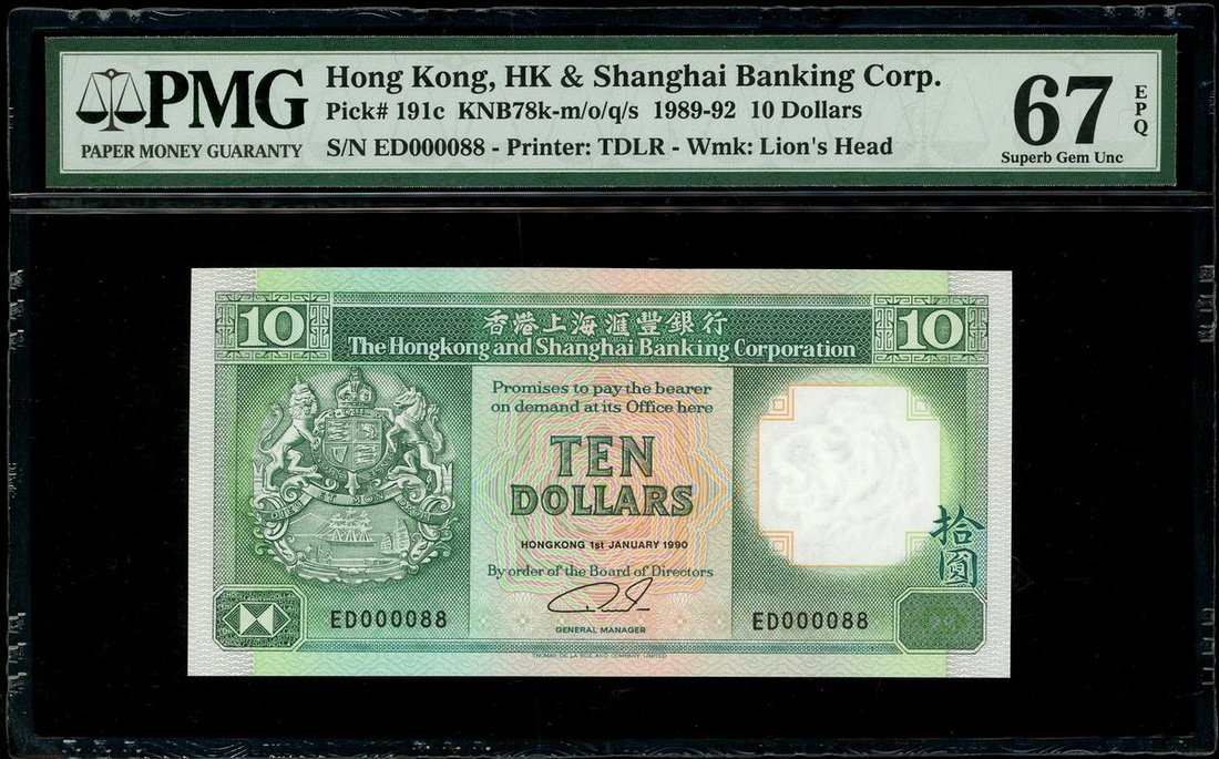 The Hongkong and Shanghai Banking Corporation, $10, 1.1.1990, fancy serial number ED000088, (Pick 191c), PMG 67EPQ Superb Gem Uncirculated
