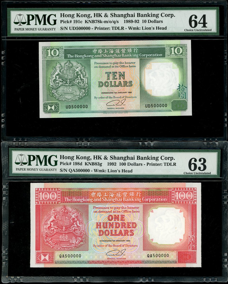 The Hongkong and Shanghai Banking Corporation, $10 and $100, 1.1.1992, identical serial number with different prefixes, UD500000 and QA500000, (Pick 191c, 198d), graded PMG 64 and 63 respectively (2)
