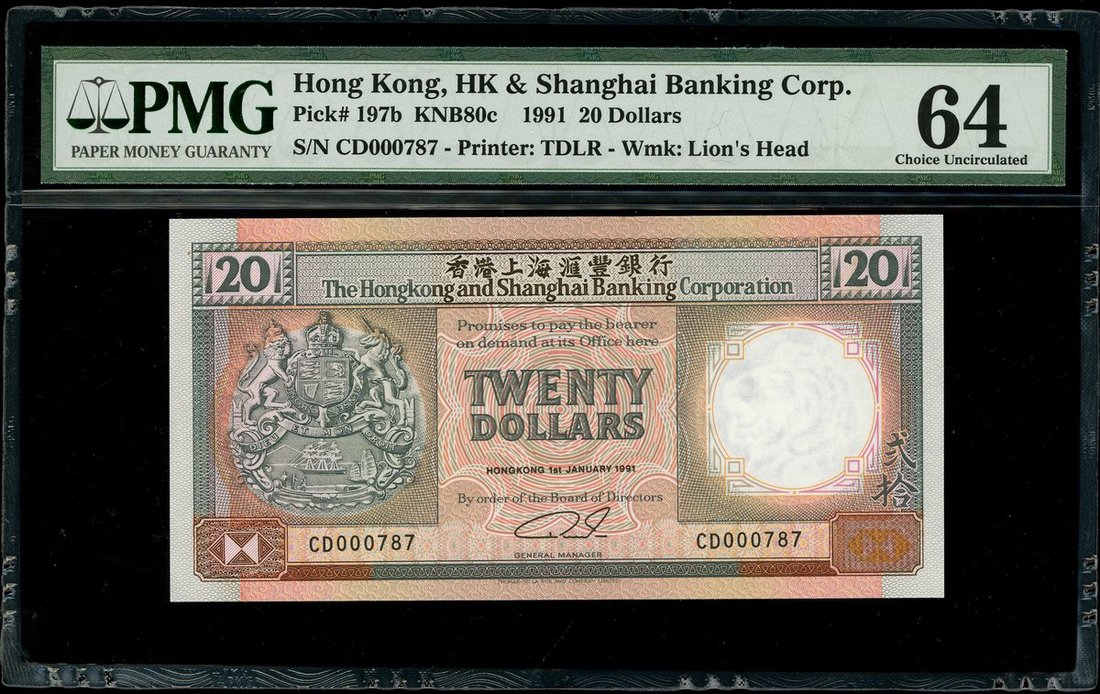 The Hongkong and Shanghai Banking Corporation, $20, 1.1.1991, fancy serial number CD000787, (Pick 197b), PMG 64 Choice Uncirculated