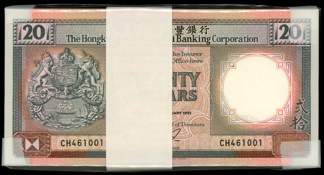 The Hongkong and Shanghai Banking Corporation, $20, 1.1.1991, consecutive run of 100, serial number CH461001-100, (Pick 197b), uncirculated (100)