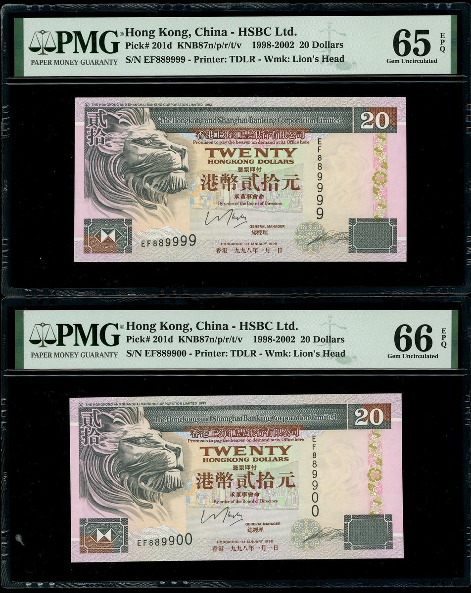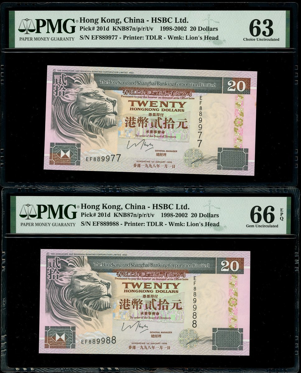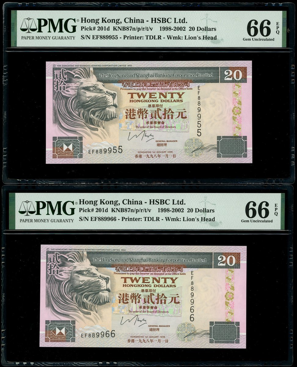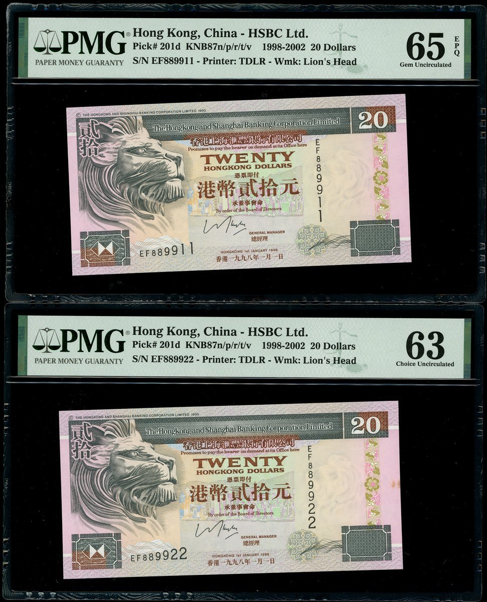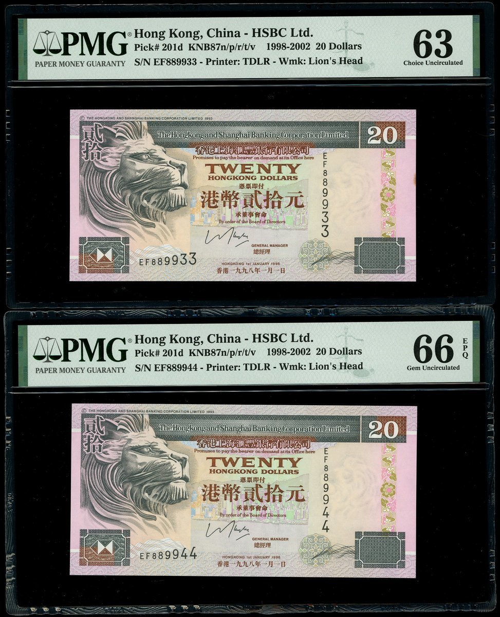 The Hongkong and Shanghai Banking Corporation, $20, 1.1.1998, fancy serial number EF889911, 22, 33, 44, 55, etc to 00, (Pick 201d), graded PMG 63 to 66EPQ (10)