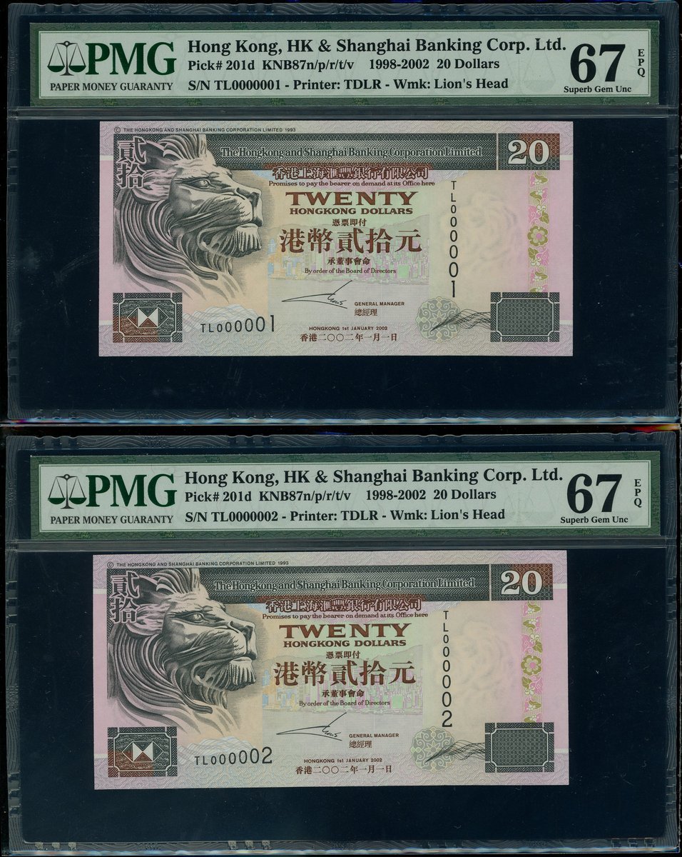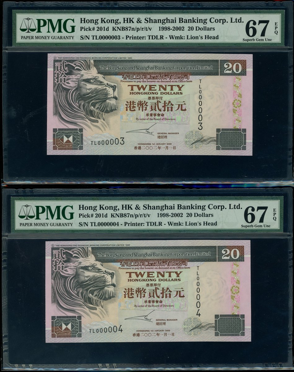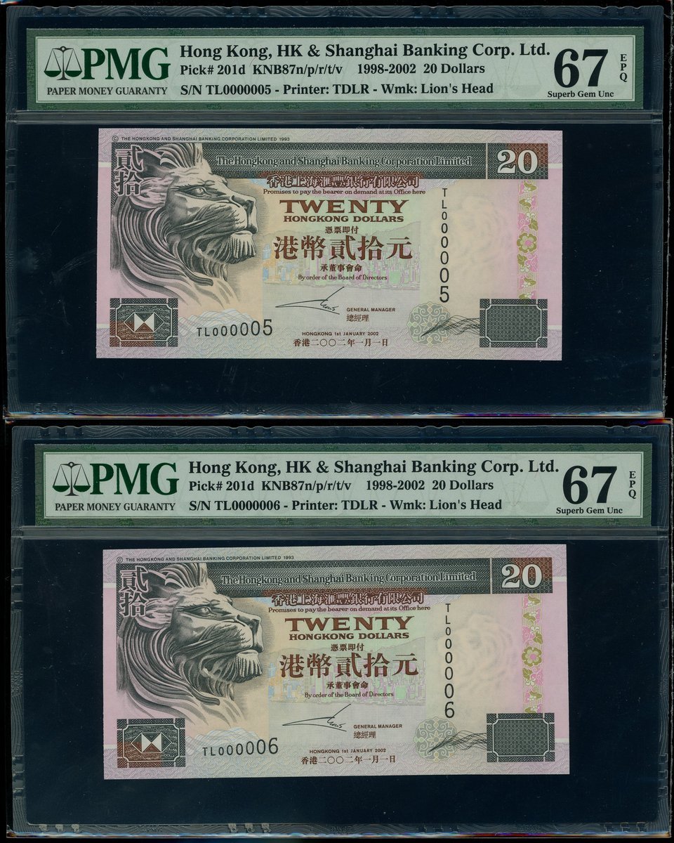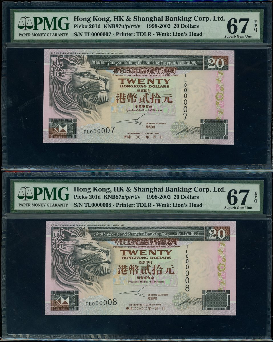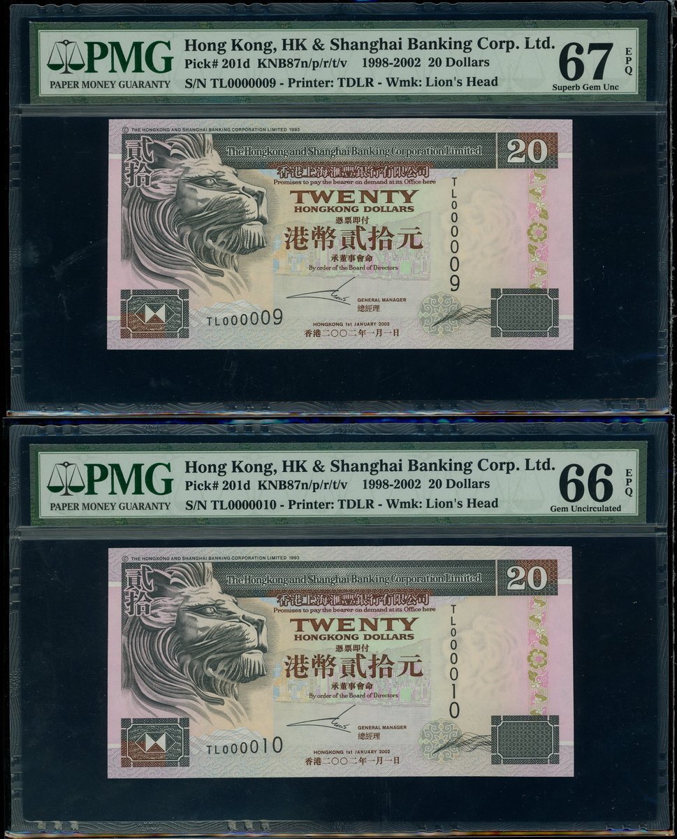 2002年匯豐銀行20元連號10枚,細號TL000001-10,除最後一枚PMG 66EPQ,其餘均67EPQ