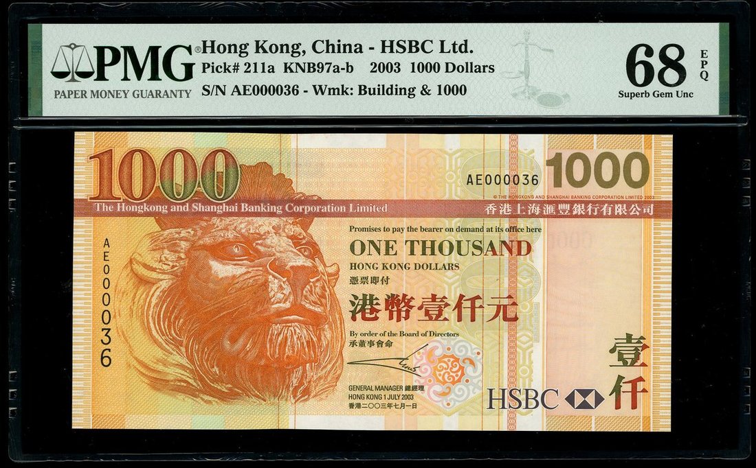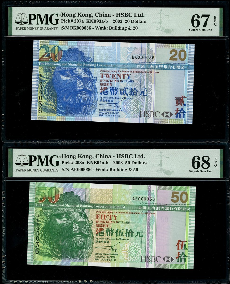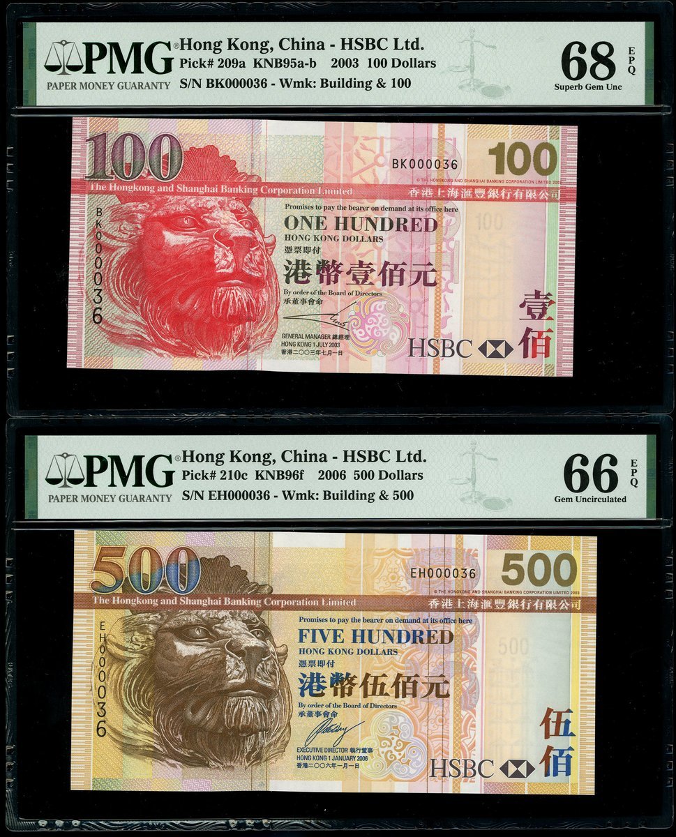 匯豐銀行一組5枚,包括2003年20、50及100元、2006年500元及2003年1000元,分別BK, AE, BK, EH 及 AE字軌,相同細號000036,分別評PMG 67EPQ, 68EPQ, 68EPQ, 66EPQ 及 68EPQ