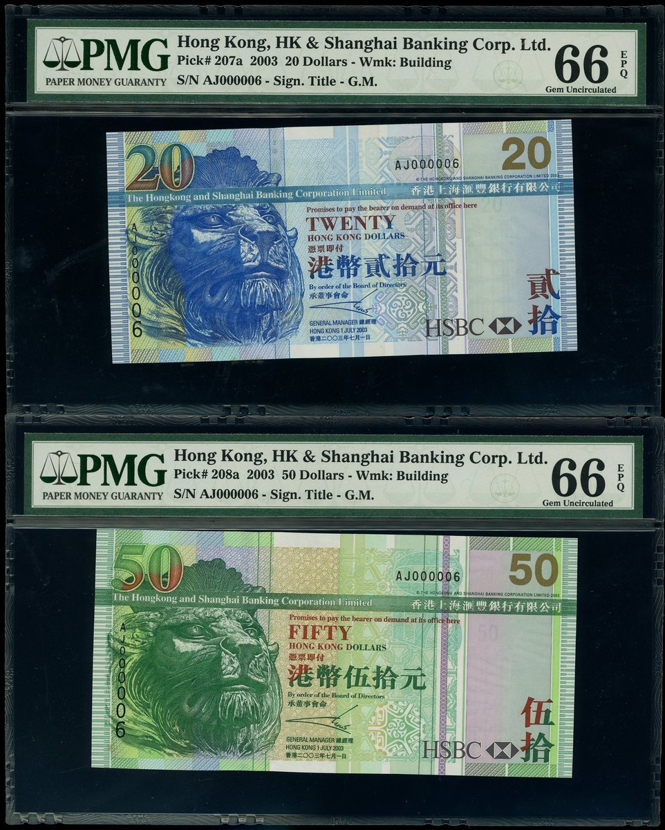 The Hongkong and Shanghai Banking Corporation, a pair of $20 and $50, 1.7.2003, identical serial number AJ000006, (Pick 207a, 208a), both graded PMG 66EPQ Gem Uncirculated (2)