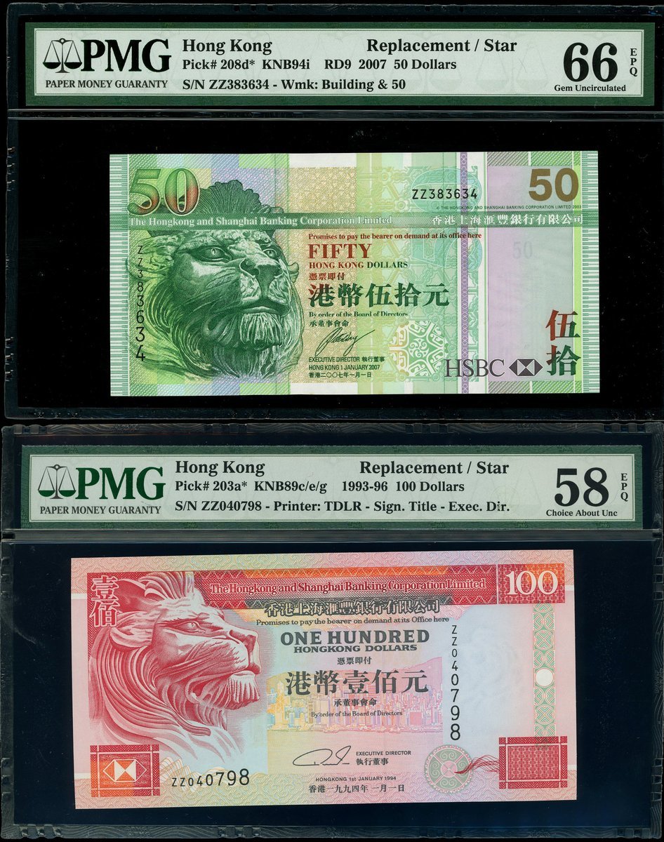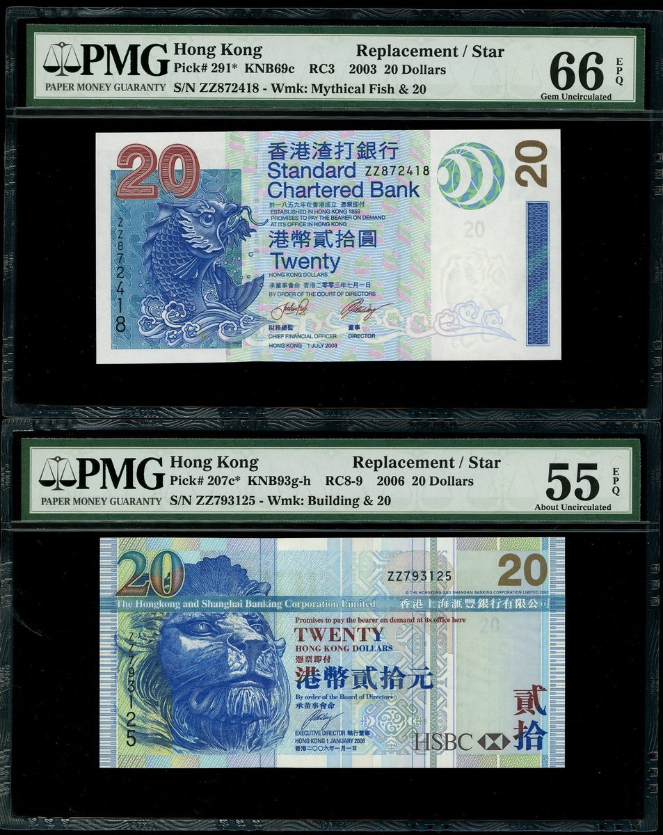 香港補版紙鈔一組4枚,包括匯豐銀行2006年20元、2007年50元、1994年100元、補號 ZZ793125、ZZ383634、ZZ040798,及2003年渣打銀行20元,補號ZZ872418,分別評PMG 55EPQ, 66EPQ, 58EPQ 及 66EPQ