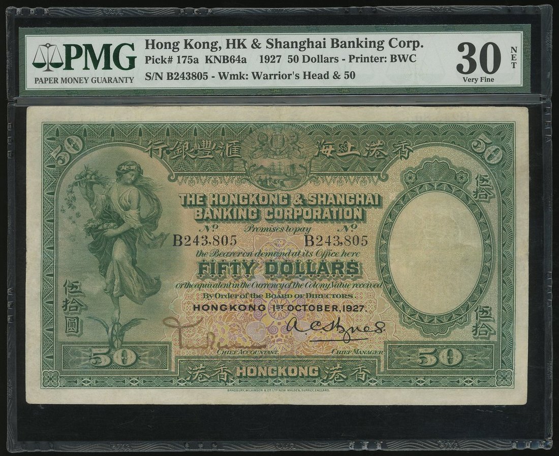 The Hongkong and Shanghai Banking Corporation, $50, 1.10.1927, serial number B243805, green on multicoloured underprint, Communication at left, arms top centre, value at centre and each corner, handsigned at lower left, reverse green, bank building at centre, angel above, serial number at four corners,