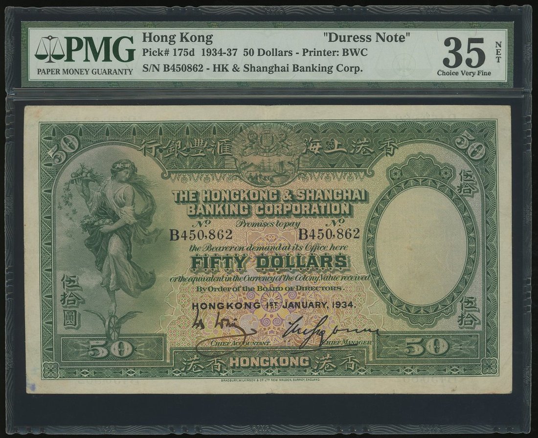 1934年匯豐銀行50元,編號B450862,PMG 35NET,有墨漬及書寫,上佳品相之原裝票