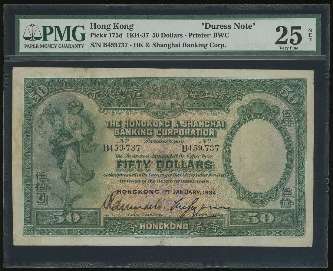 1934年匯豐銀行50元,編號B459737,PMG 25NET,有修補