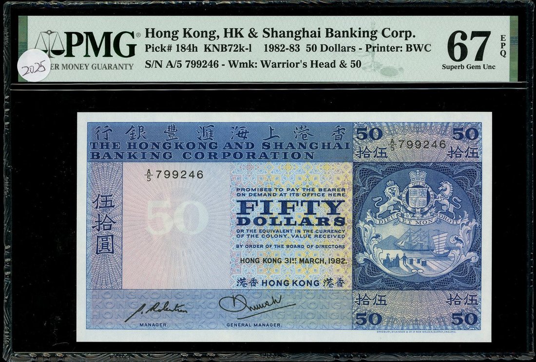 The Hongkong and Shanghai Banking Corporation, $50, 31.3.1982, serial number A/5 799246, (Pick 184h), PMG 67EPQ and choice