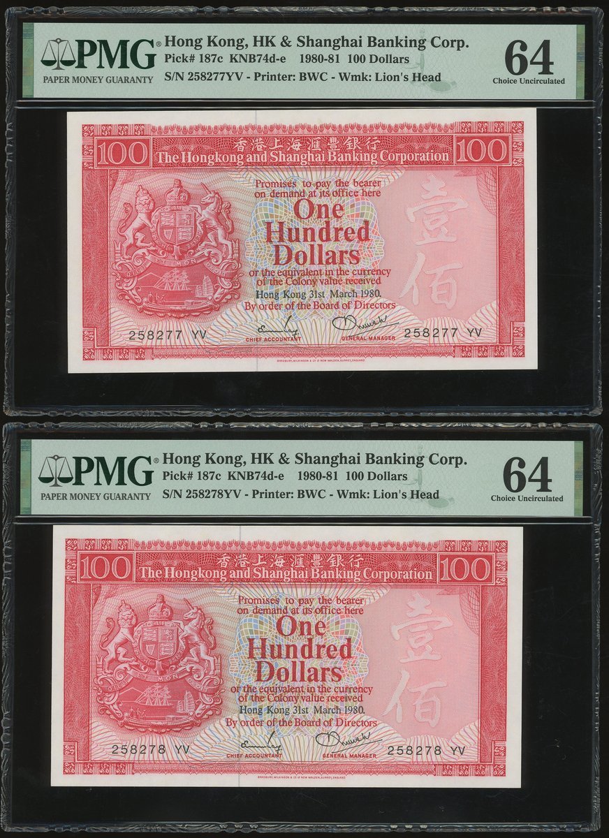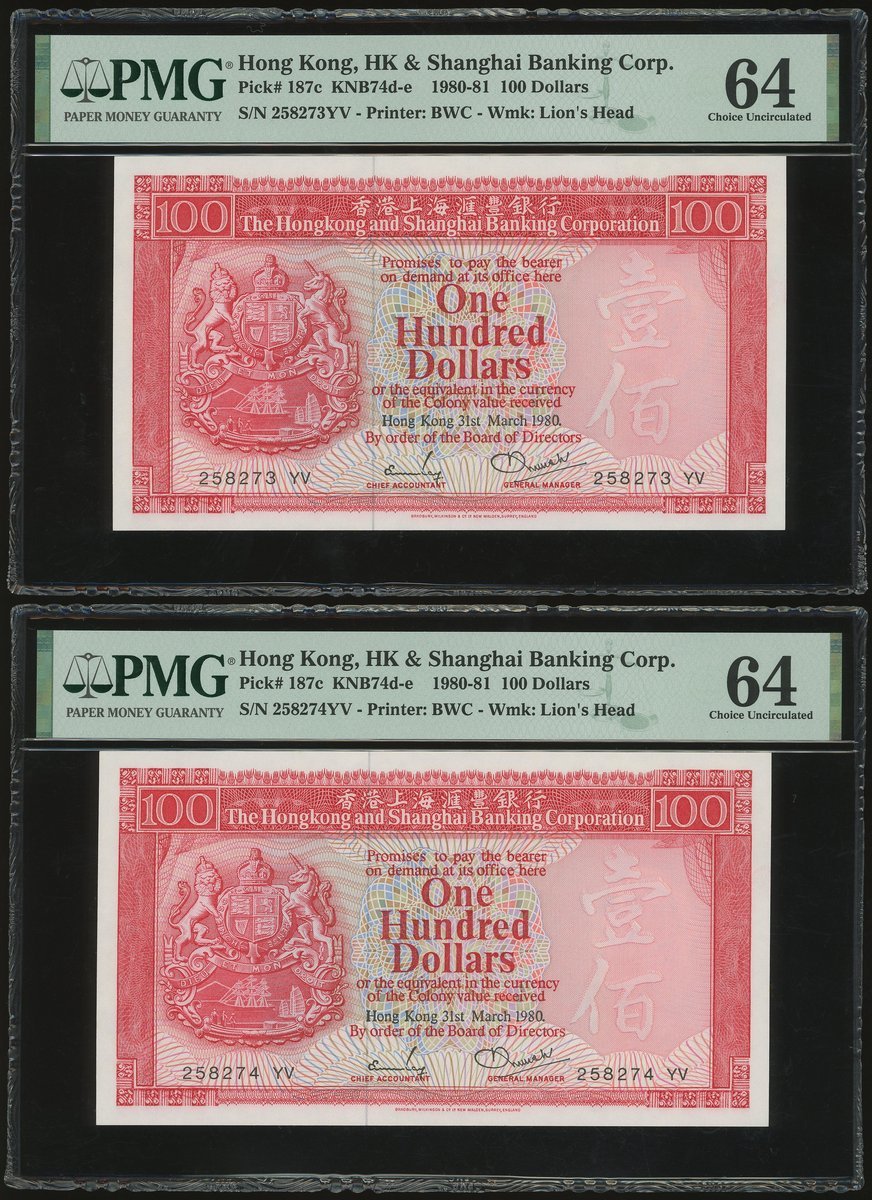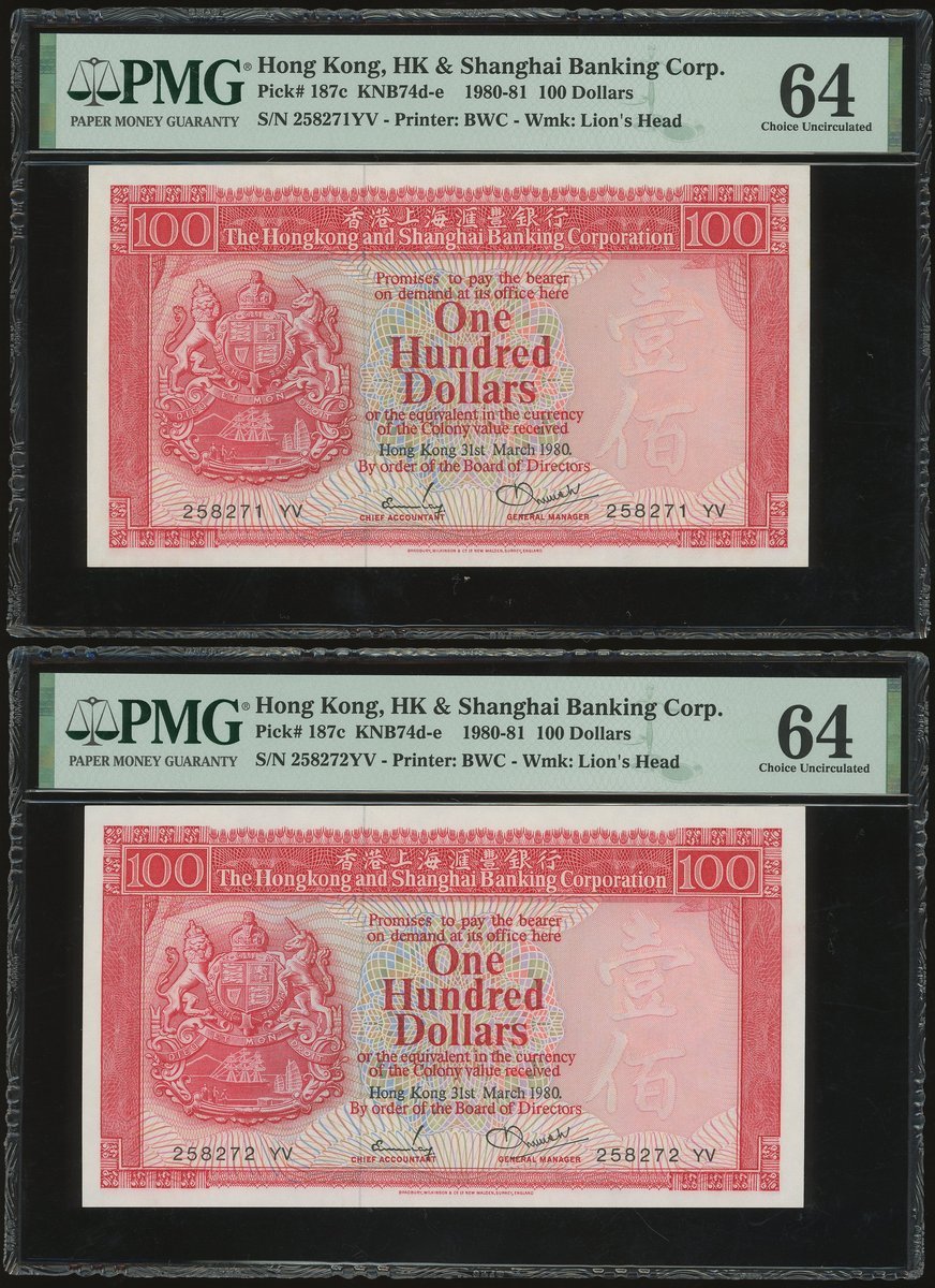 1980年匯豐銀行100元連號10枚,編號258271-280 YV,及1985年50元3枚,編號AA346235, 547 及 548,100元除258280評PMG 58外,其餘評PMG 64,50元全評58EPQ