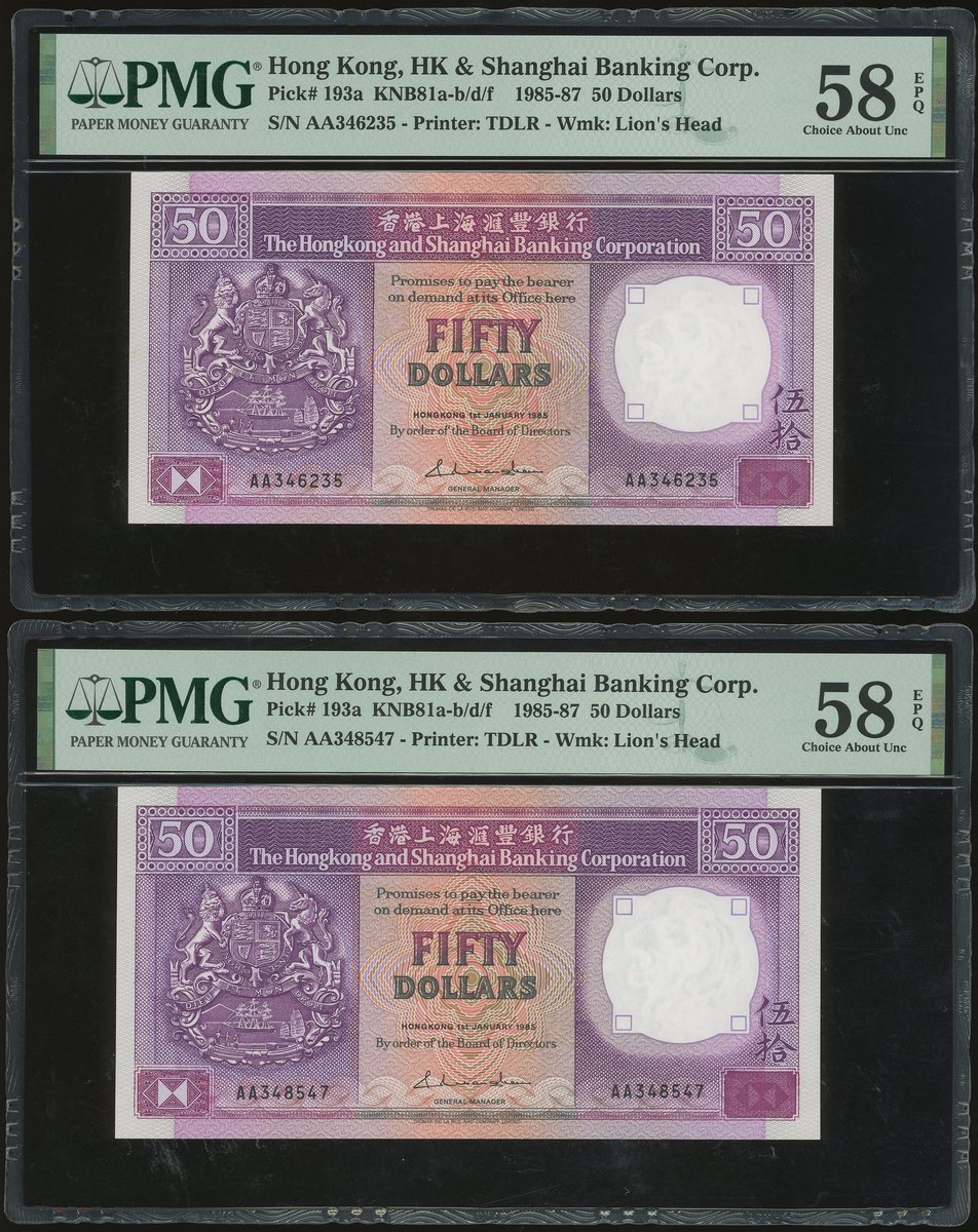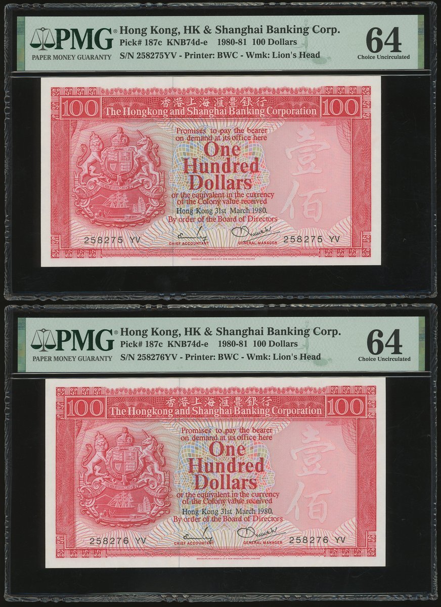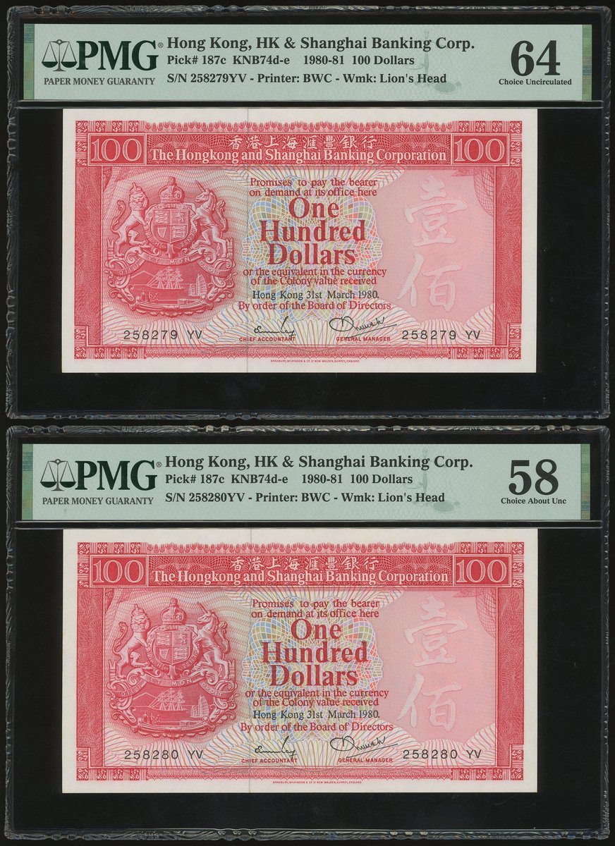 1980年匯豐銀行100元連號10枚,編號258271-280 YV,及1985年50元3枚,編號AA346235, 547 及 548,100元除258280評PMG 58外,其餘評PMG 64,50元全評58EPQ
