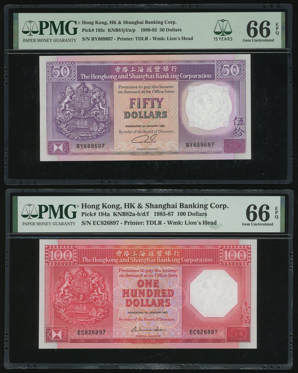 匯豐銀行1992年50元及1987年100元,編號BY669697 及 EC826897,均PMG 66EPQ