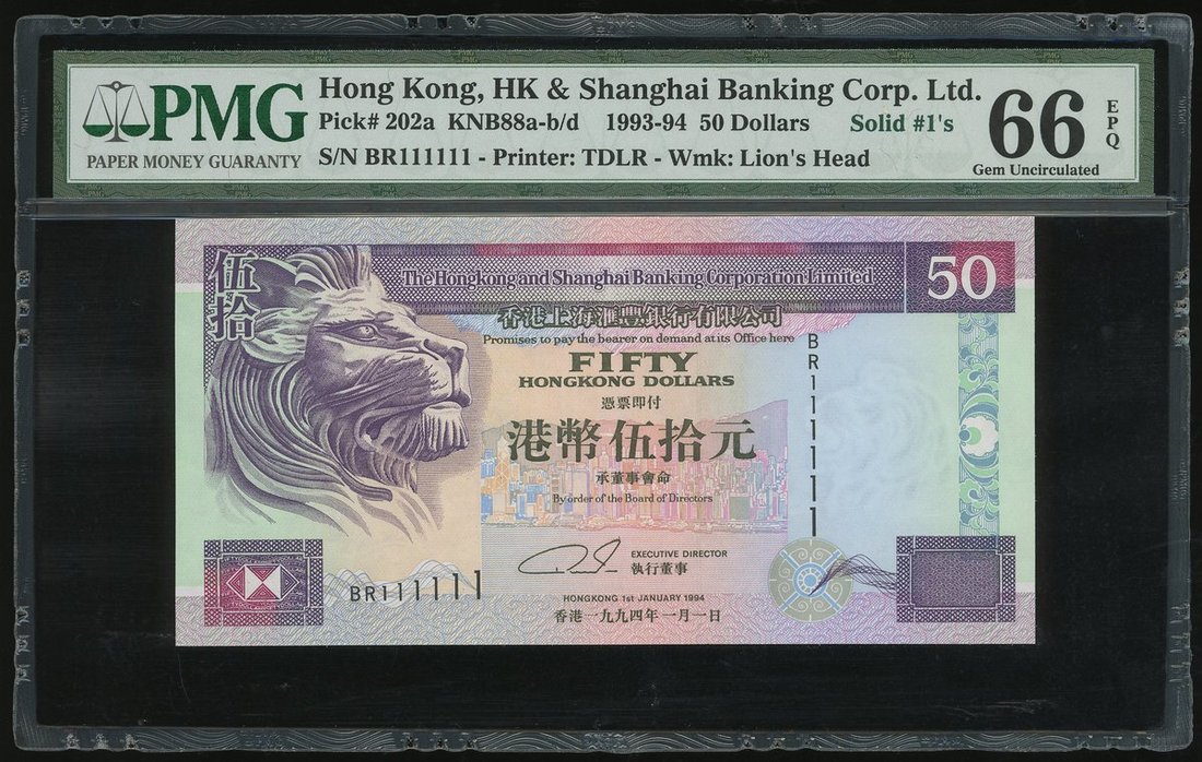 The Hongkong and Shanghai Banking Corporation, $50, 1.1.1994, solid serial number BR111111, (Pick 202a), PMG 66EPQ Gem Uncirculated