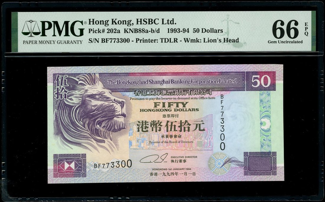 Hong Kong & Shanghai Banking Corporation, $50, 1st January 1994, fancy serial number BF773300, (Pick 202a), PMG 66EPQ.