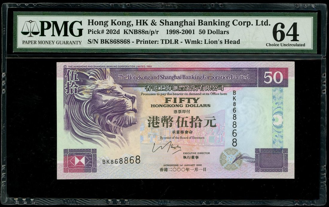 The Hongkong and Shanghai Banking Corporation, $50, 1.1.2000, radar-repeater serial number BK868868, (Pick 202d), PMG 64 Choice Uncirculated