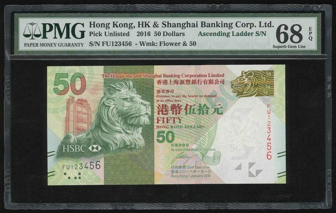 The Hongkong and Shanghai Banking Corporation, $50, 1.1.2016, ascending serial number FU123456, PMG 68EPQ Superb Gem Uncirculated, rare high grade lucky number note