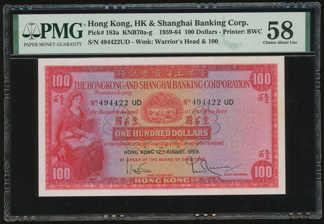 Hong Kong & Shanghai Banking Corporation, $100, 12th August 1959, serial number 494422UD, (Pick 183a), PMG 58, choice about uncirculated.