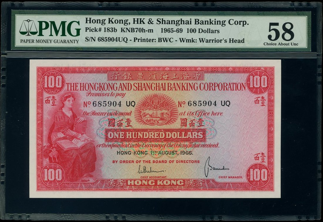 Hong Kong & Shanghai Banking Corporation, $100, 1966, serial number 685904UQ, (Pick 183b), PMG 58, choice about uncirculated.