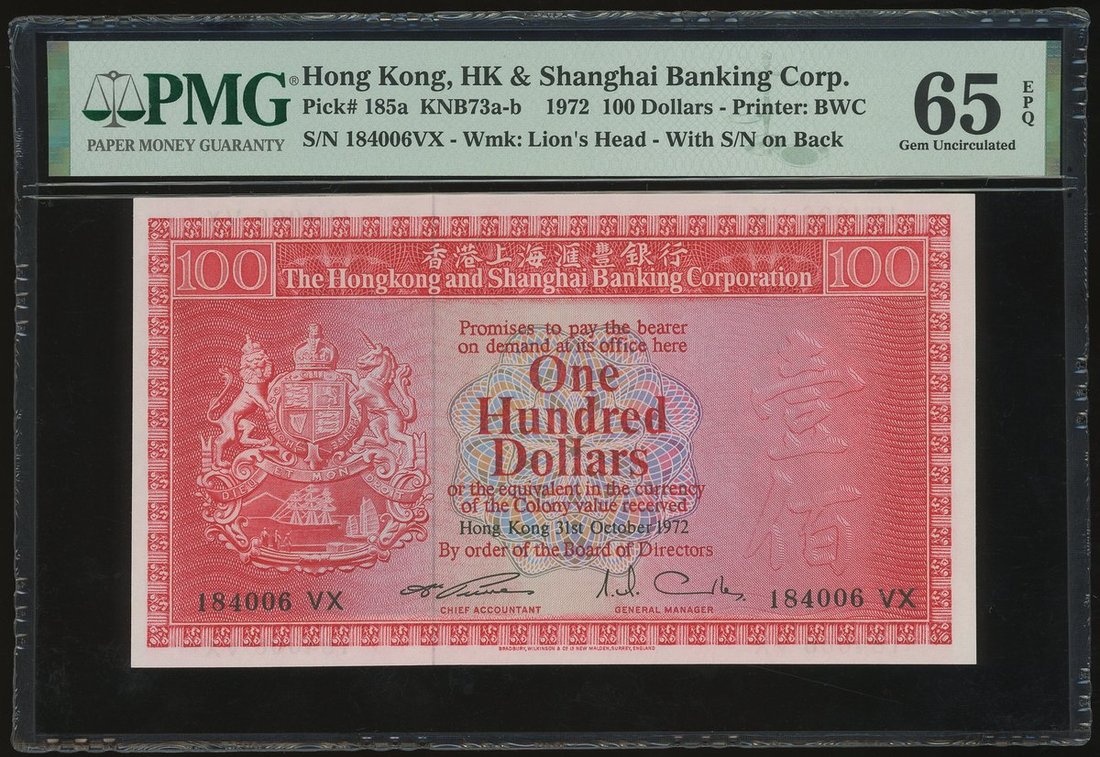 The Hongkong and Shanghai Banking Corporation, $100, 31.10.1972, serial number 184006VX, (Pick 185a), PMG 65EPQ Gem Uncirculated