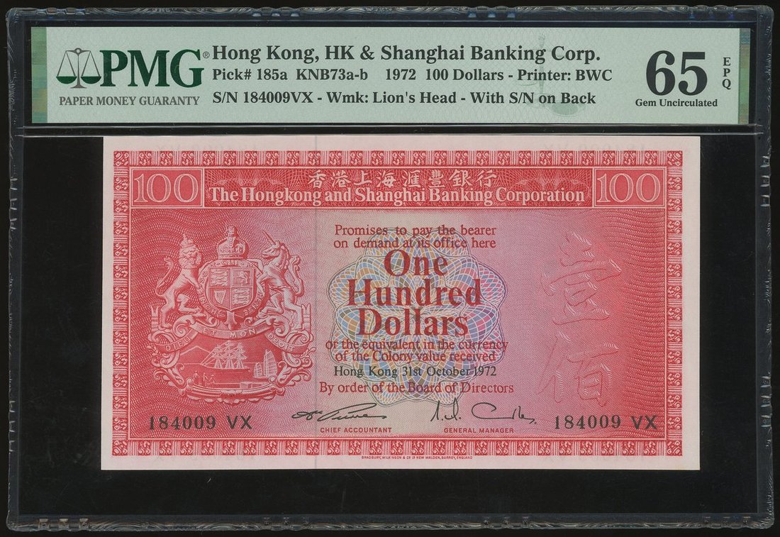 The Hongkong and Shanghai Banking Corporation, $100, 31.10.1972, serial number 184009VX, (Pick 185a), PMG 65EPQ Gem Uncirculated