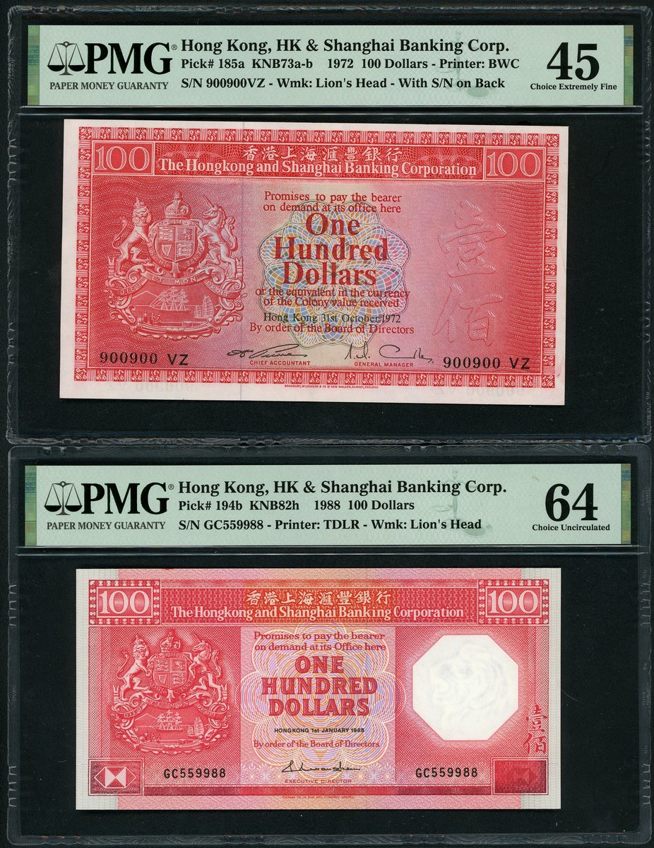 1972及88年匯豐銀行100元一對,趣味號900900 VZ 及C559988,分別PMG 45及64