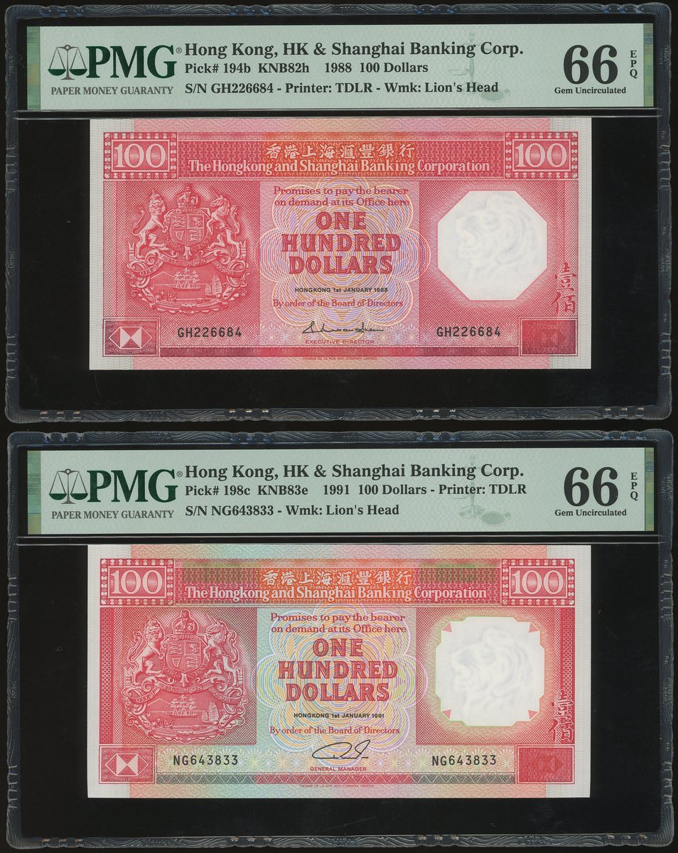 The Hongkong and Shanghai Banking Corporation, 2x $100, 1.1.1988 and 1.1.1991, serial numbers GH226684 and NG643833, (Pick 194c, 198c), both graded PMG 66EPQ Gem Uncirculated (2)