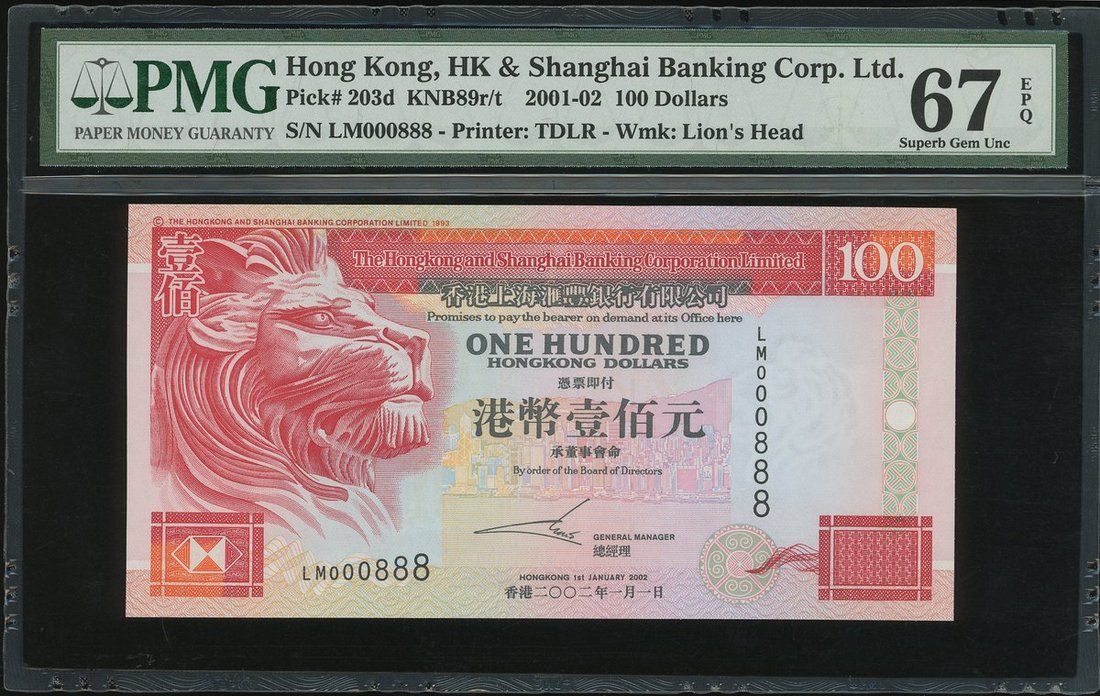 The Hongkong and Shanghai Banking Corporation, $100, 1.1.2002, fancy serial number LM000888, (Pick 203d), PMG 67EPQ Superb Gem Uncirculated