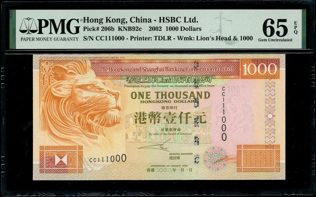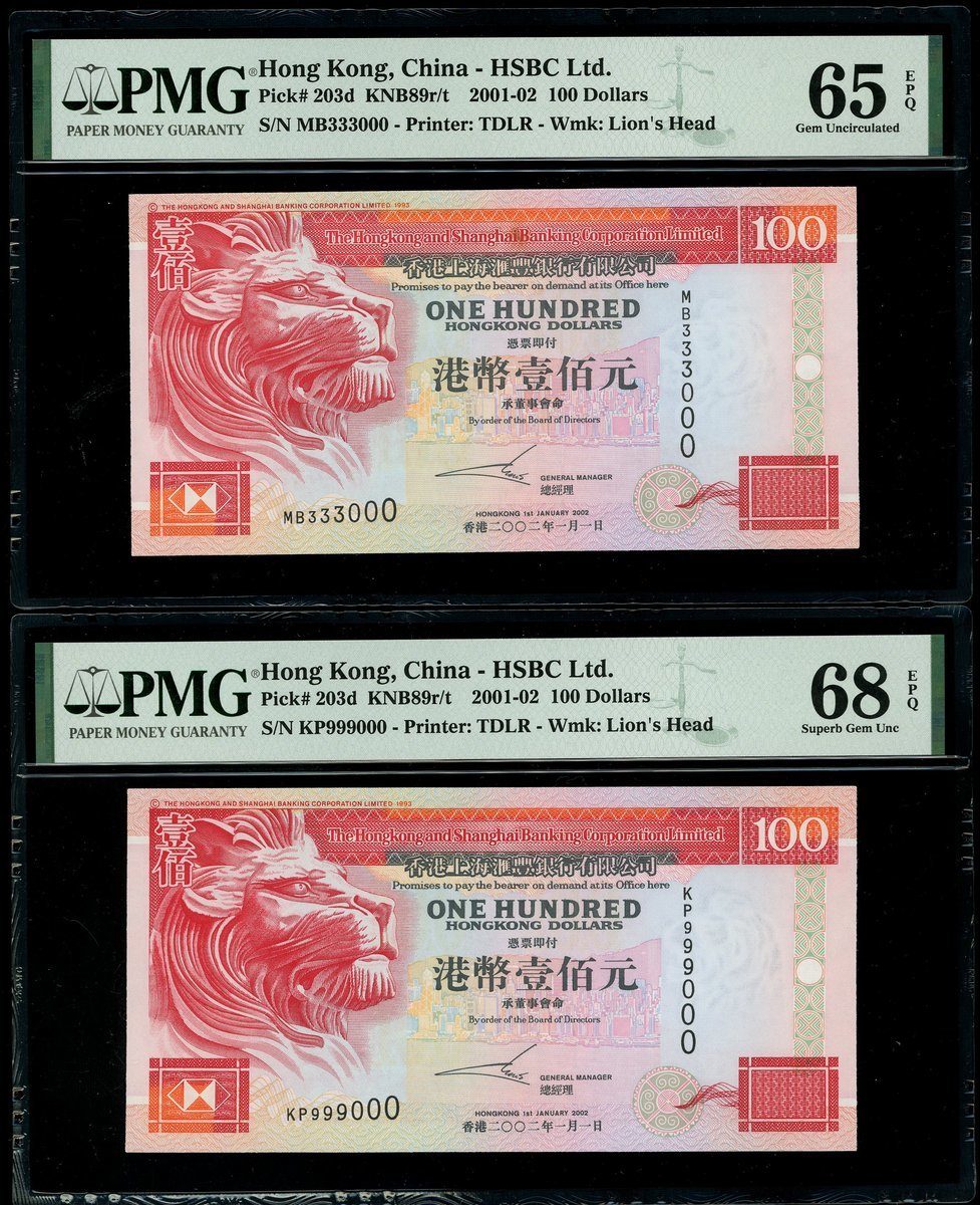 The Hongkong and Shanghai Banking Corporation, group of 3, consisting of $100 (2) and $1000, 1.1.2002, fancy serial numbers MB333000, KP999000 and CC111000, (Pick 203d, 206b), graded PMG 65EPQ, 68EPQ and 65EPQ (3)