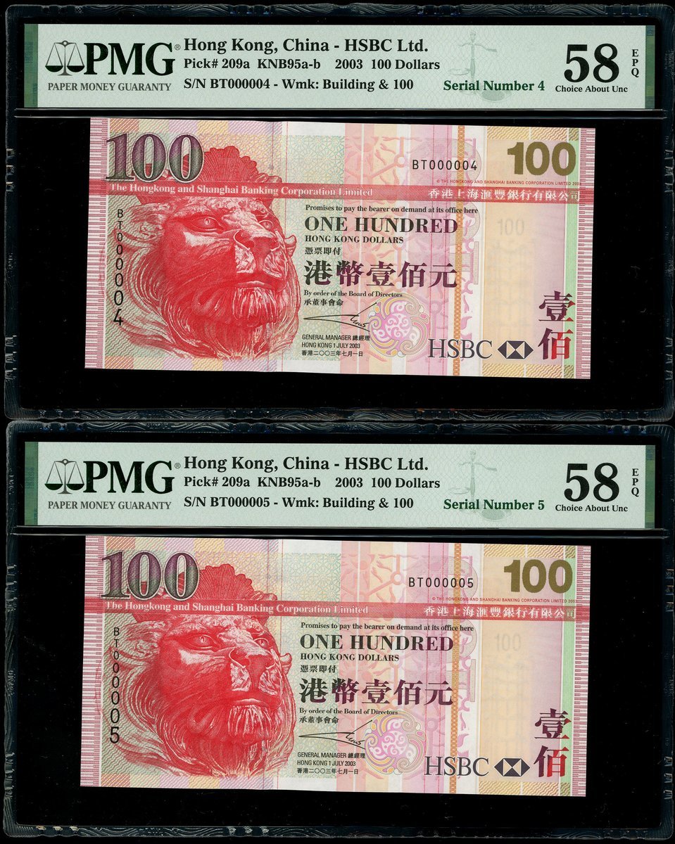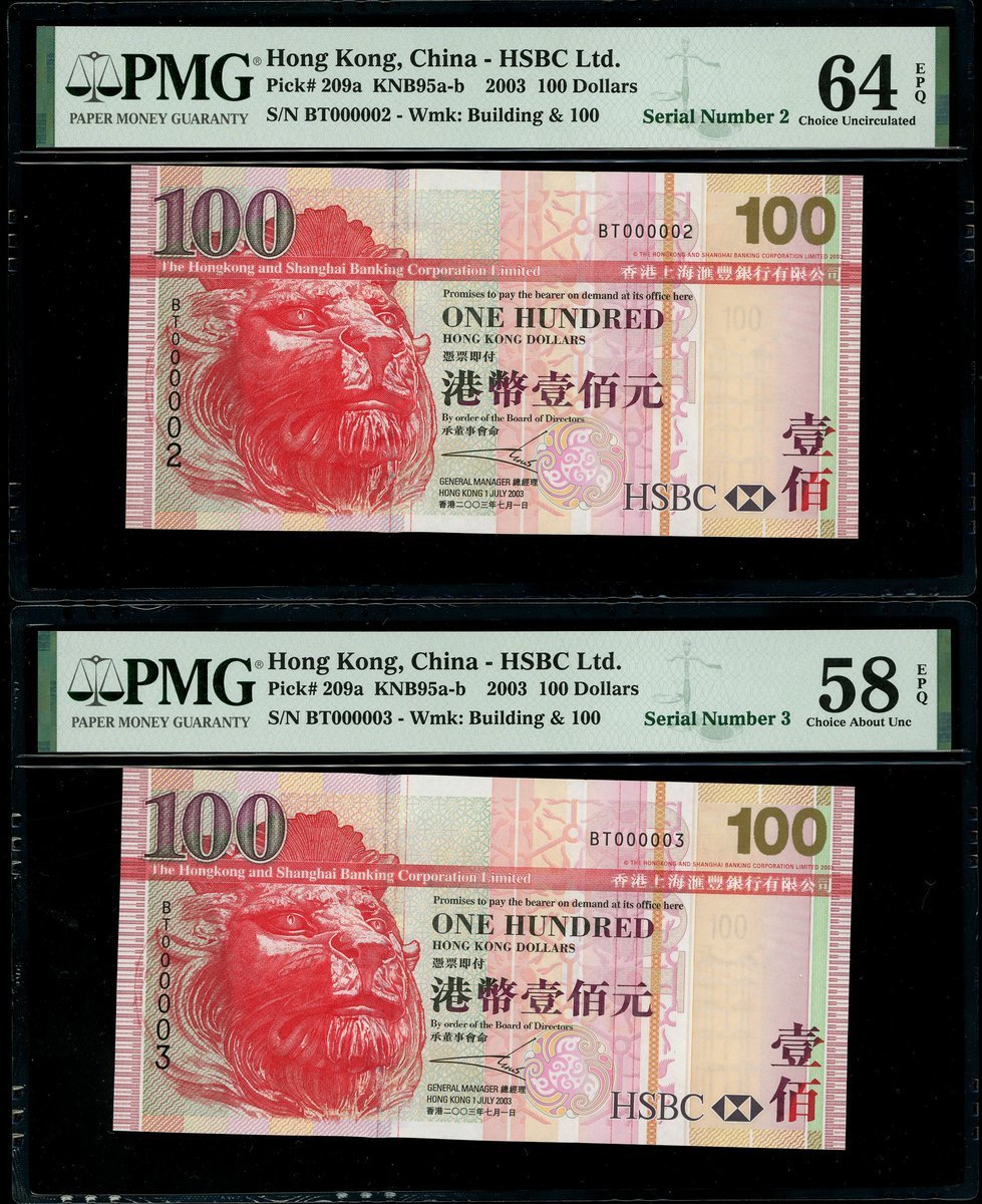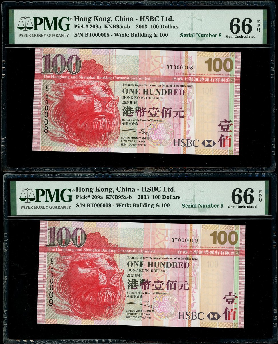 Hong Kong & Shanghai Banking Corporation, a lot of 9x $100, 1st July 2003, low serial number BT000002-10, (Pick 2009a), all PMG graded, number 8-10 with 66EPQ, number 2 with 64EPQ, the rest 58EPQ.(9)