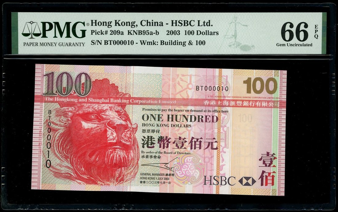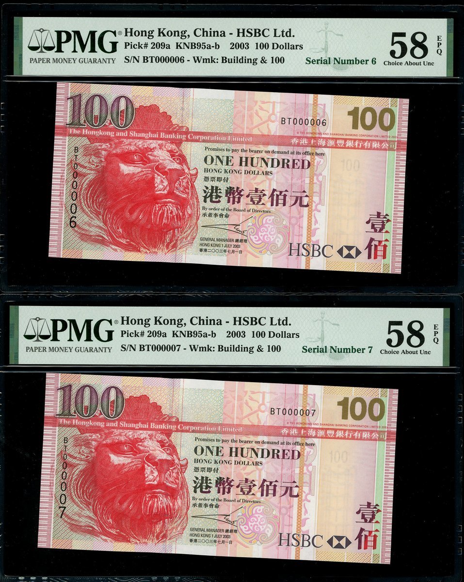 2003年匯豐銀行100元連號9枚,細號BT000002-10,尾號8-10號評PMG 66EPQ,2號評64EPQ,其餘評58EPQ