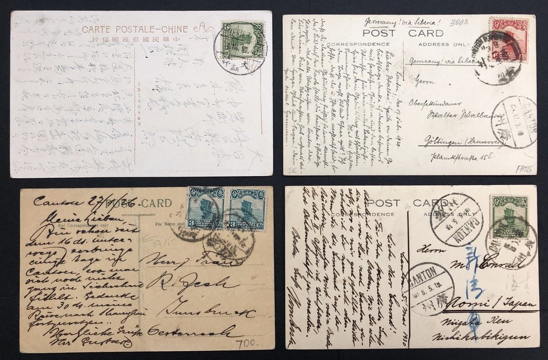 1930年代廣州明信片3 枚, 分別是惠愛中路(貼三分票两枚, 寄外國), 五層樓(貼六分票寄外國) 及郊區農耕(貼两分票寄日本), 另加一枚天津法租界明信片(貼2分票)寄日本. 品相中上.