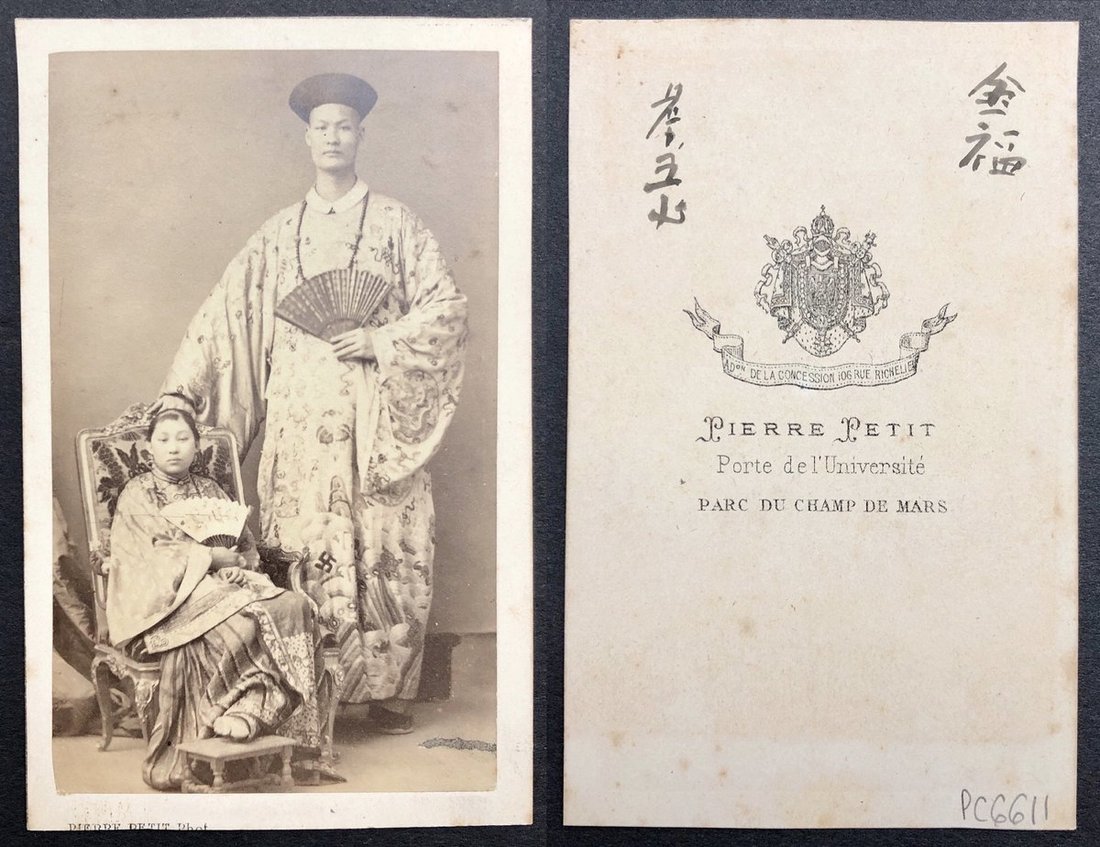 1870-1880s photos of the Qing Dynasty giant Zhan Wujiu and his wife Jin Fu, On the back with their brush signature , rare. Size: 10.5 x 6.5cm