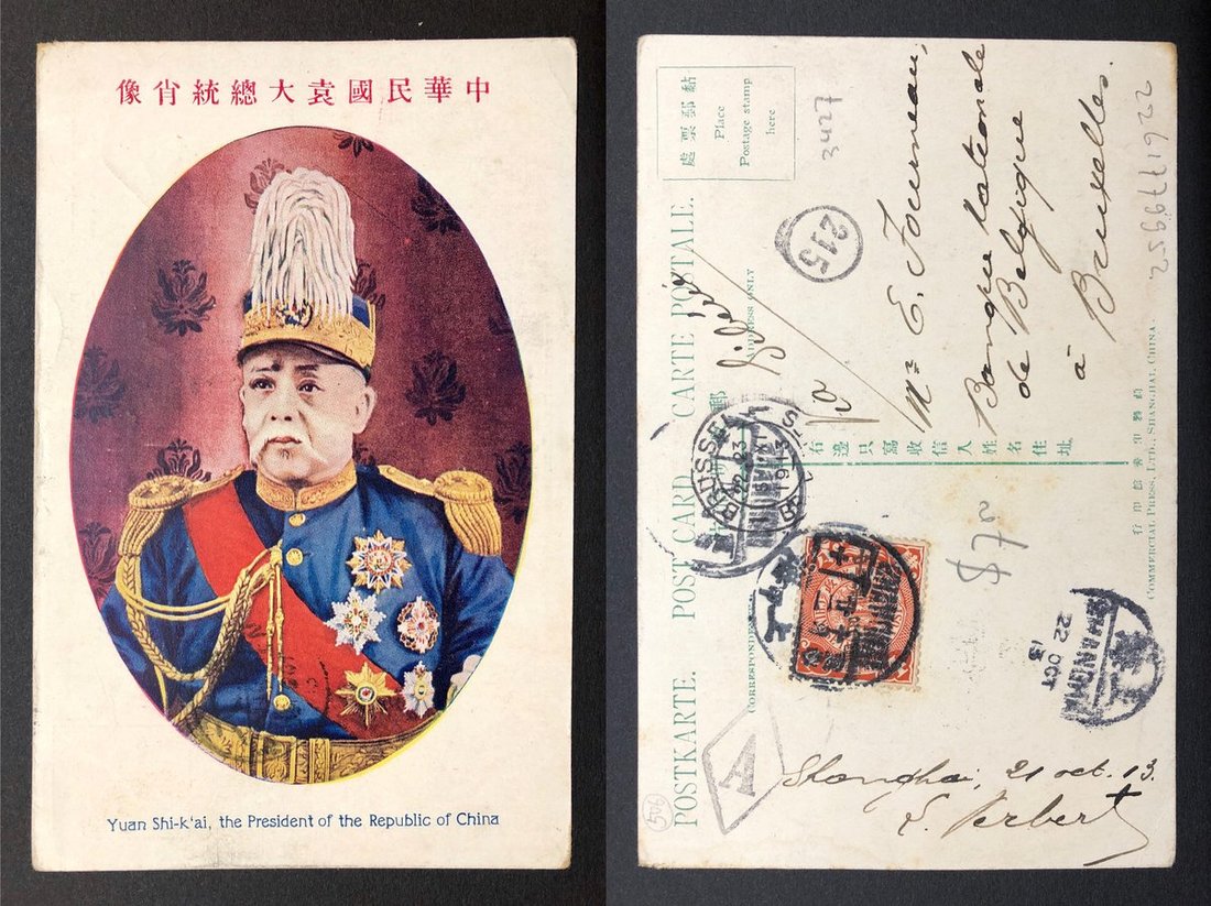 1913 (Oct.) colour postcard of Yuan Shi Kai, the President of the Republic of China, from Shanghai to Belgium, bearing overprinted C.I.P. 4c., tied by Shanghai bilingual c.d.s., Such color-printed Yuan Shi Kai's postcard from China sent overseas are very rare, it is a very collectable item.