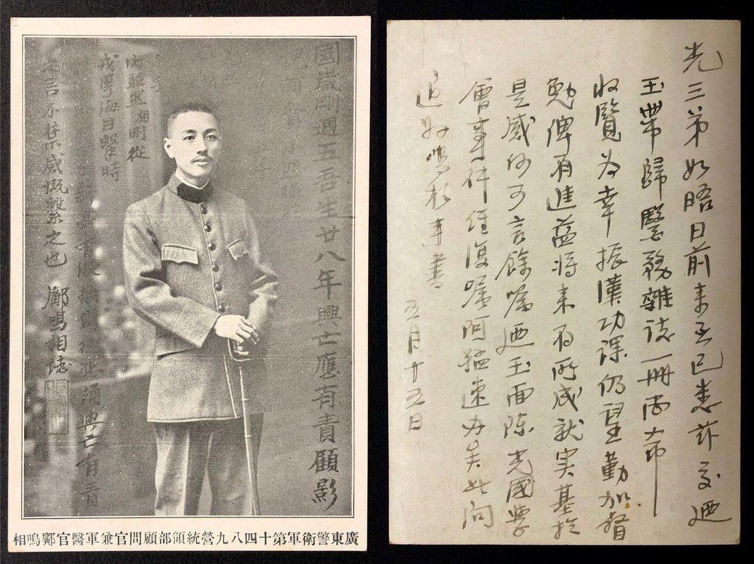1920s picture card of Kuang Mingxiang, the advisory officer and military medical officer of the 10, 4, 8, 9th Battalion Command Department of the Guangdong Guard Army, with his handwritten letter on the back, rare and fine.