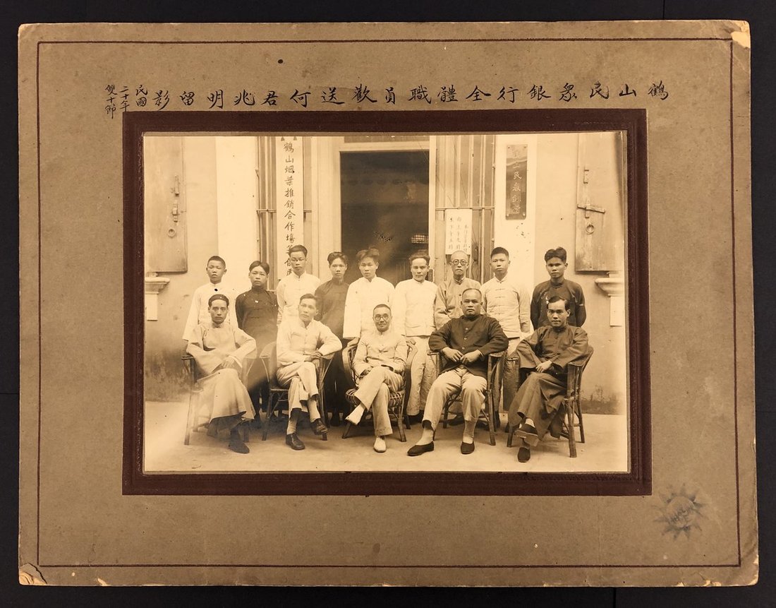 1931年10月10日鶴山民眾銀行全體職員歡送同事何兆明的老照片. 由麗生映相館拍攝. 照片貼於厚咭, 保存良好.
