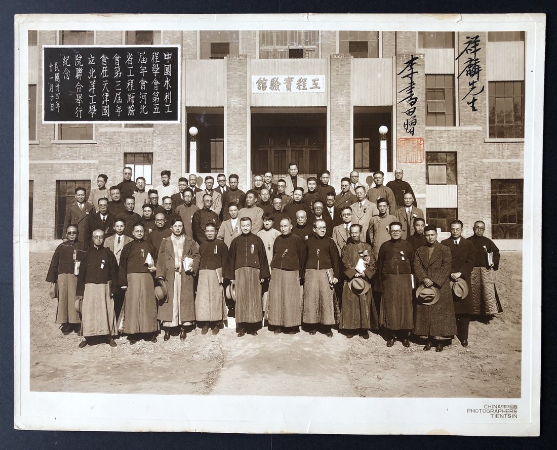 1935年11月10日中國水利工程學會在天津國立北洋工學院合照, 由天津中國攝影館拍攝. 並由北洋工學院院長李書田在照上簽名送給祥麟先生. 保存良好.