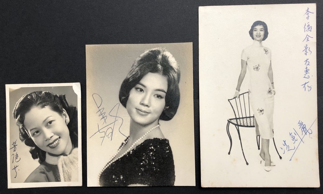 1960年代香港女明星親筆簽名照片三幅, 分別是芳艷芬, 冼劍麗及嘉玲. 尺寸不一.