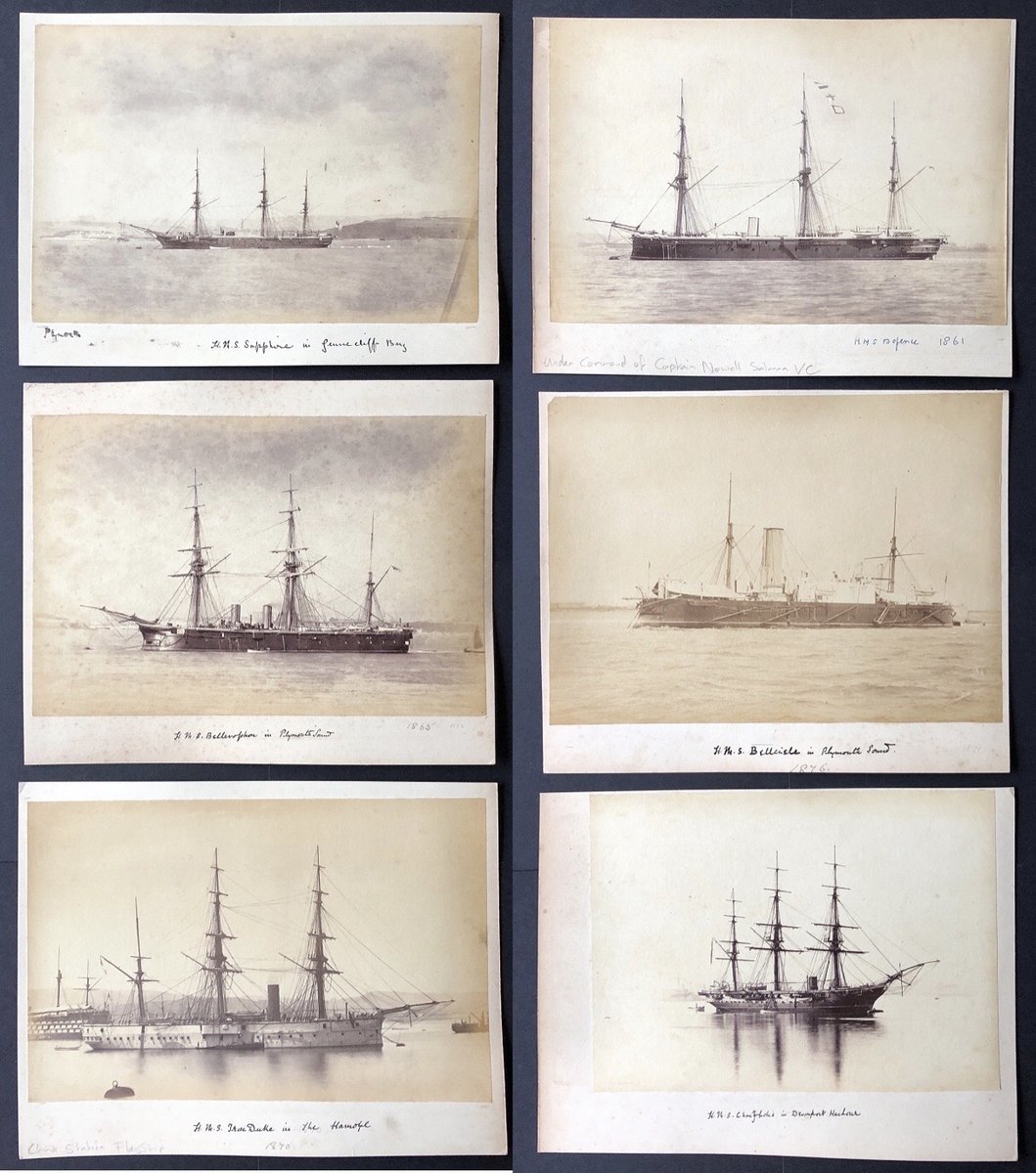 1860-70年代英國戰艦蛋白照片6 幅, 分别貼於三枚咭紙上, 戰艦包括曾派駐於中國基地的旗艦H.M.S. Iron Duke號, 及H.M.S. Defence號, H.M.S. Belleisle號, H.M.S. Bellerophon號, H.M.S. Sapphire號和H.M.S. Charybdis號等的珍貴影像, 十分罕有.