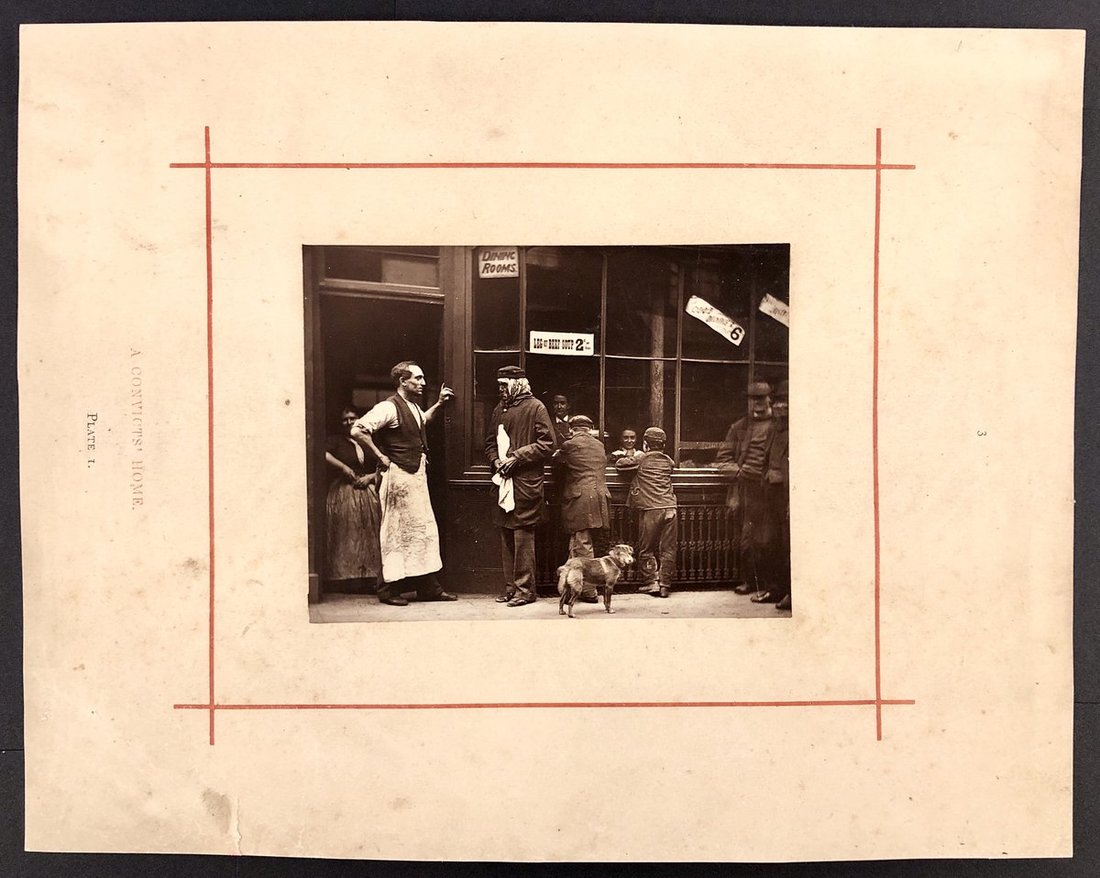 1880年代由著名攝影師John Thomson(約翰·湯姆森) 拍攝之" Aconvicts Home" 此照片表現於1877年由前警察Bayliss先生在倫敦的Drury Lane經營著一間前囚犯維多利亞式餐廳而,Bayliss先生路在相片左邊,正與當地的印度籍鼓手Ramo Sammy交談. 此照片貼於一書頁上.