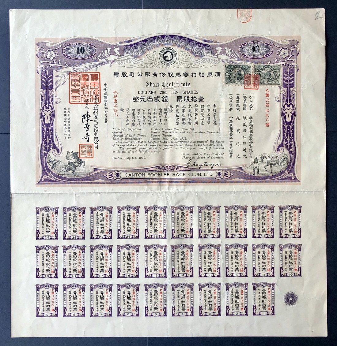 1922, Canton Fooklee Race Club Ltd., certificate for 10 shares worth $200, extremely fine, includes interest coupons.