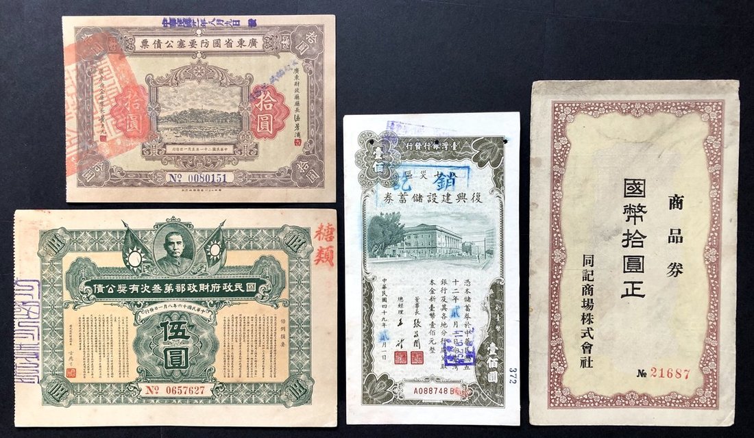 1927-1960年s4枚一組,包括1927年有獎公債5元,1931年廣東省國防要塞公債10元,1930-1940年代哈爾濱同記商場10元商品券,以及臺灣銀行復興建設儲蓄券100元,VF至EF品相。