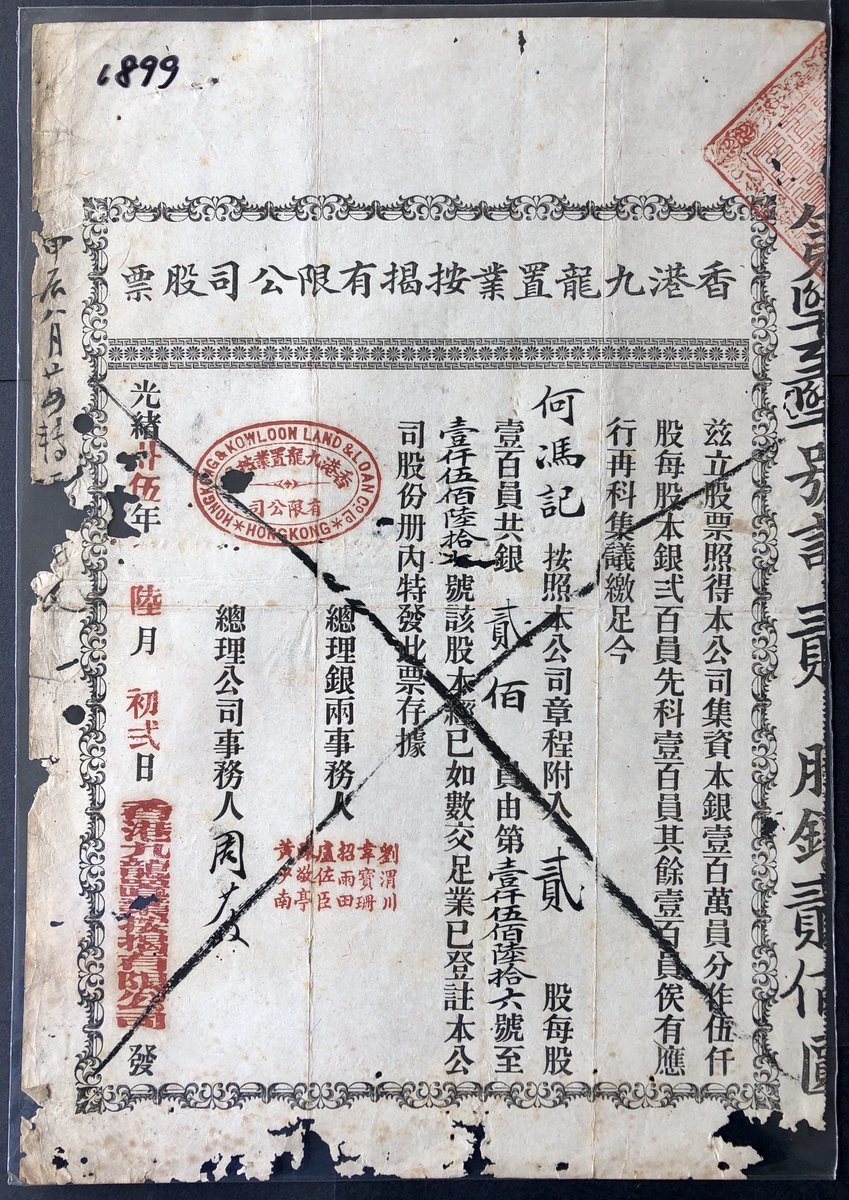 1899, Hong Kong & Kowloon Land & Loan Company Limited, certificate for 2 shares worth $200, number 1566-1567, very good to fine, a very early Hong Kong share certificate