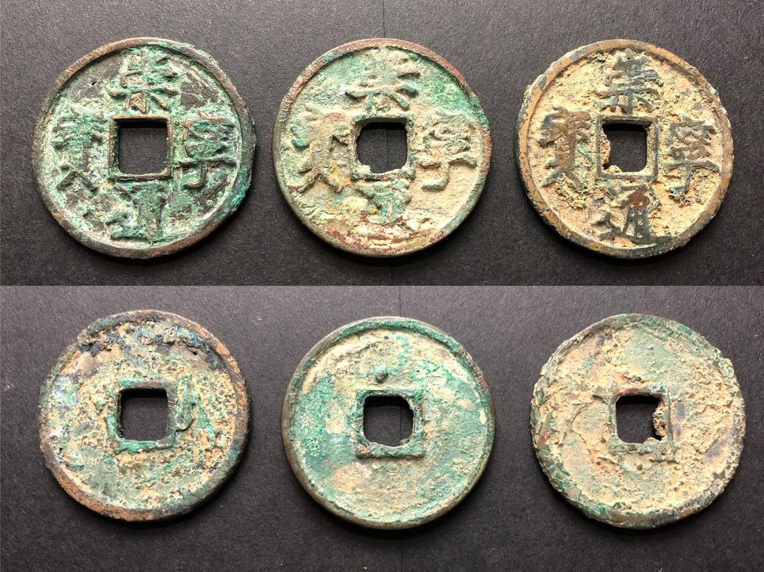 1102-1106年宋朝崇寧重寶3枚一組,其中一枚背上星,F至VF品相,售後不設退換。
