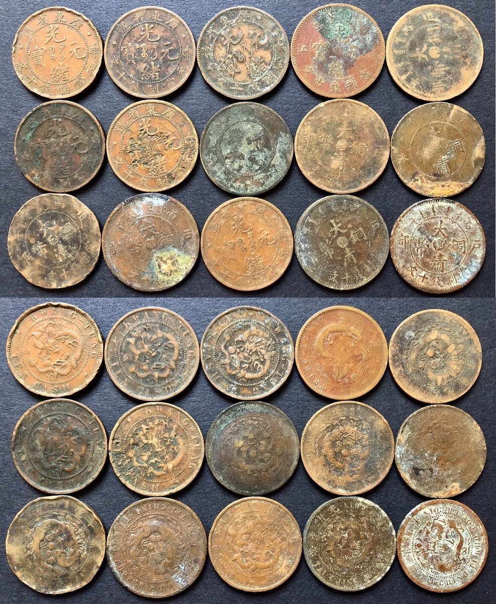 1870-1900年代清朝銅幣15枚一組,包括大清銅幣8枚,廣東省光緒元寶6枚及清江省光緒元寶1枚,F至VF品相。