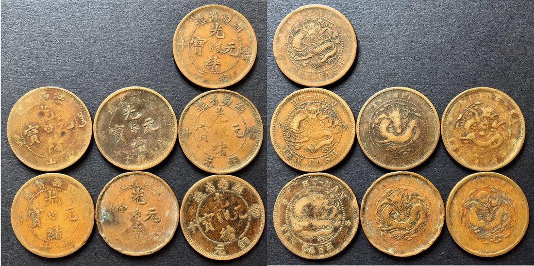 1875-1908年清朝光緒元寶當十銅元7枚一組,包括湖南省3枚,安徽省2枚及江西省2枚,F至VF品相。