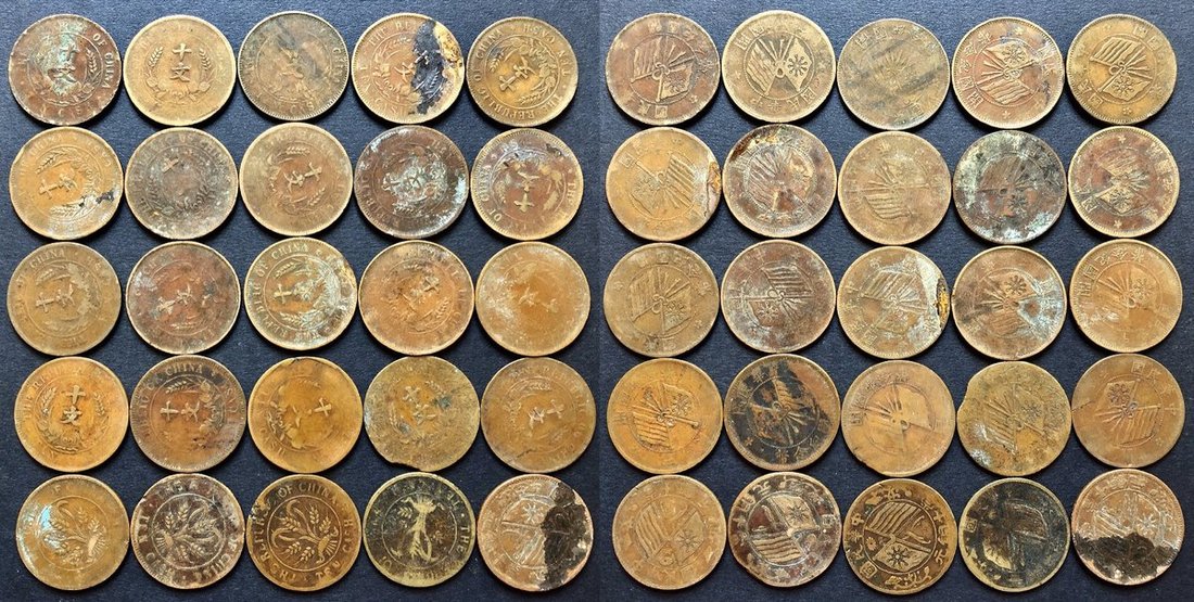 1920年代中華民國開國紀念幣10文銅幣25枚一組,正面雙旗,F至VF品相。