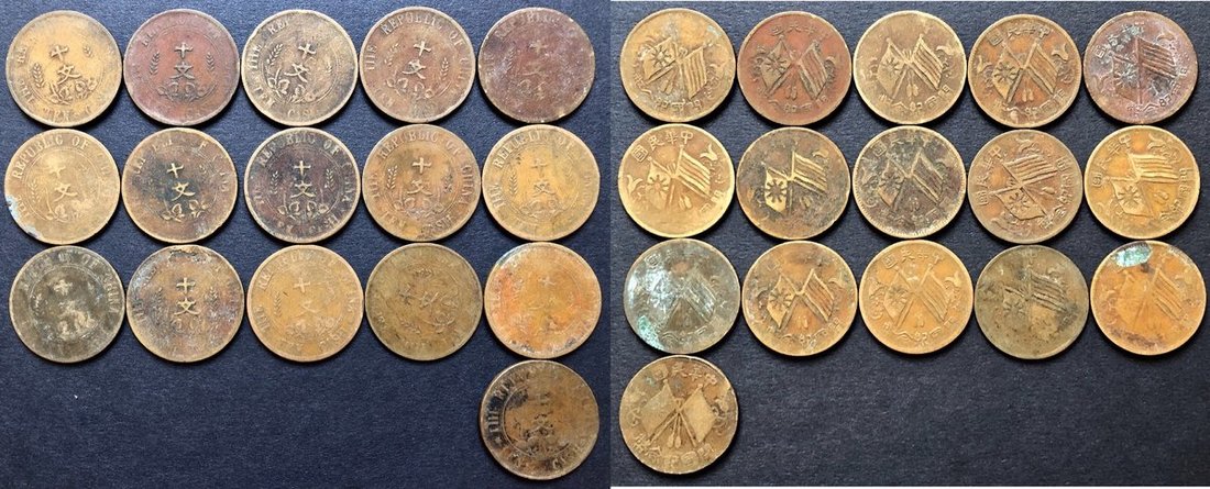 1920年代中華民國開國紀念幣10文銅幣16枚一組,正面雙旗,F至VF品相。